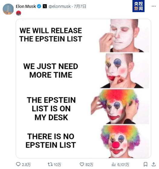 而此前一天,在美国联邦调查局及司法部公布结论后,马斯克也曾在 X 上发布一张小丑形象的梗图,回应美司法部对爱泼斯坦案的表态。