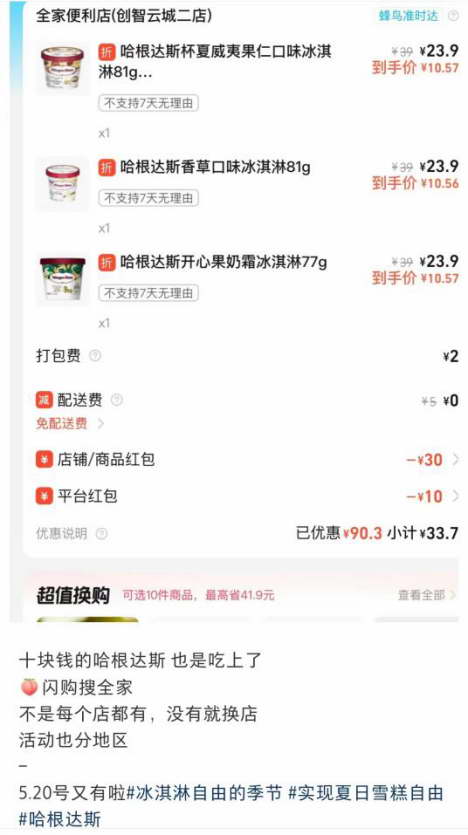有网友发现叠加优惠券后哈根达斯只需要 10 块,一度怀疑 “哈根达斯是不是要倒闭了”。(图 / 小红书截图)