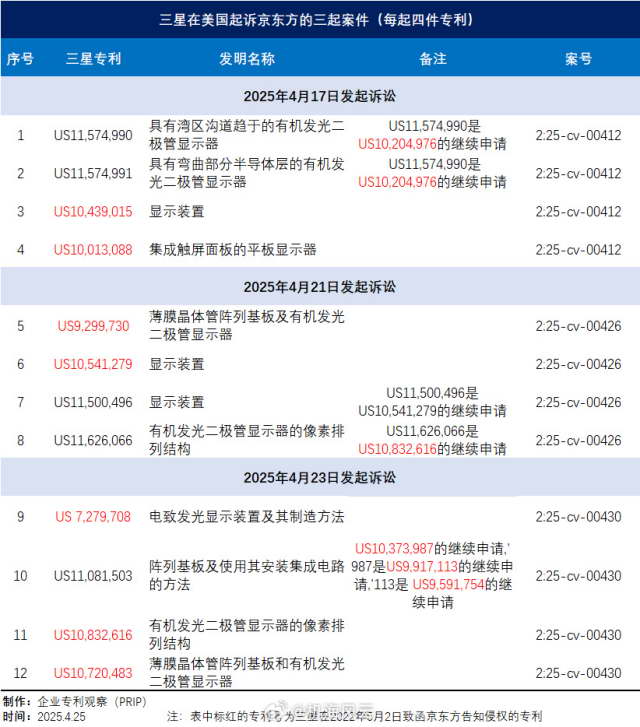 京东方也不是吃素的,开始发起了反击 —— 2024 年,它就在重庆起诉三星侵犯其 3 项 OLED 核心专利,紧接着在今年 5 月,又在美国反诉三星,指控 Galaxy Z Fold 6 屏下摄像头技术侵犯了 4 项专利。