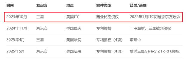 随后,三星在 2023 年 10 月又向 ITC 发起诉讼,指控京东方通过挖角核心员工、合谋供应链企业等方式,窃取其 OLED 面板的核心商业机密( 包括制造设备图纸 ),并用于成都 8.6 代 OLED 产线建设。