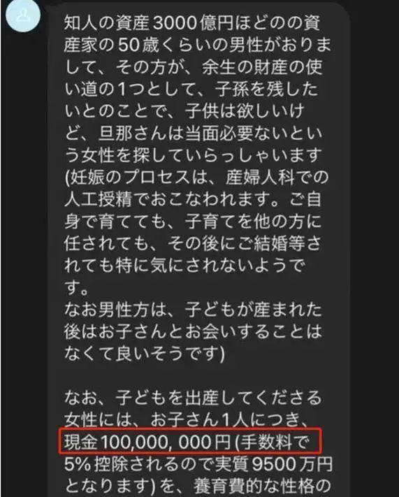 为了生子,他甚至委托星探发布求子广告,重金寻求高质量女性代孕,并许诺只要生下孩子,能拿到 1 亿日元的奖励。