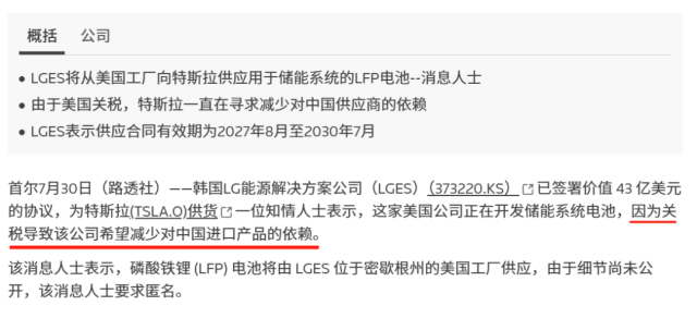 根据路透社的说法,特斯拉的真实目的,很可能就是为了在关税影响下,减少对中国磷酸铁锂电池的依赖。