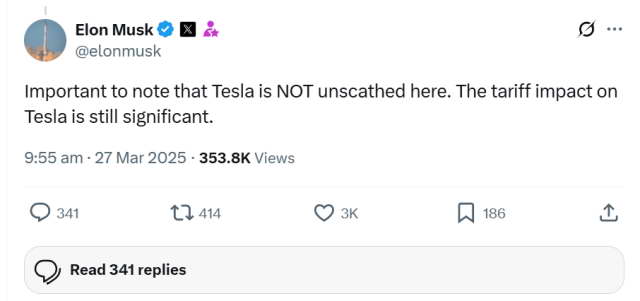 但至少说明,在关税压力下,特斯拉不再采取 “全球供应链” 策略,而是走向 “ 本土化生产 ” 。