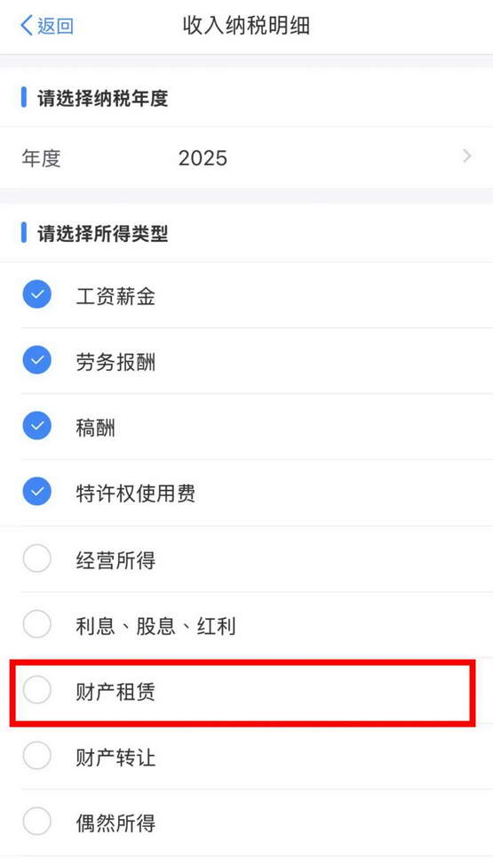 收入纳税明细,就有「财产租赁」这一项。