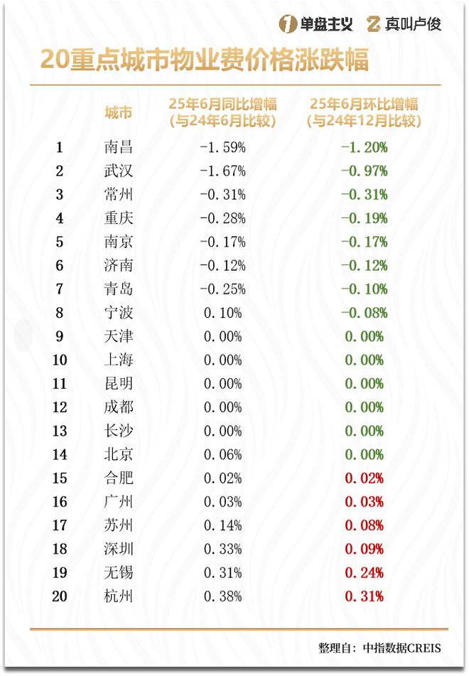 2025 年 6 月,二十城物业服务价格综合指数为 1074.47,同比下跌 0.11%,环比下跌 0.08%