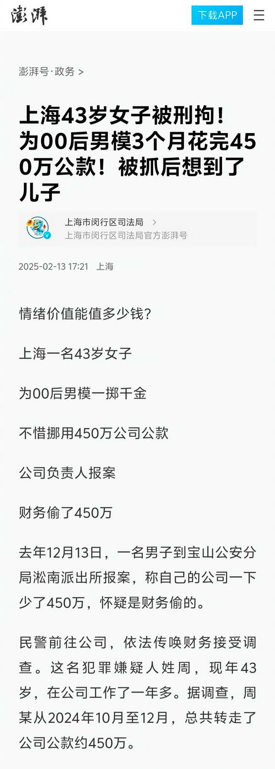 她像个被欲望操控的木偶,一边知道自己在犯罪,一边又停不下挥霍的手。从 2024 年 10 月到 12 月,短短 3 个月,她从公司账户里转走了 450 万,全部花在了酒吧和男模身上。她清楚地知道,这些钱早晚有一天会被发现,自己早晚要坐牢,可她还是抱着 “能享受一天是一天” 的心态,放纵着自己。3 个月的快乐,换一辈子的自由。被逮捕后,周某终于清醒了。