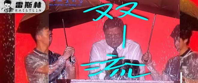 两位穿雨衣的学生,自发上台为校长撑伞,结果雨水顺势都落在校长头上,网友戏称这就叫双一流。