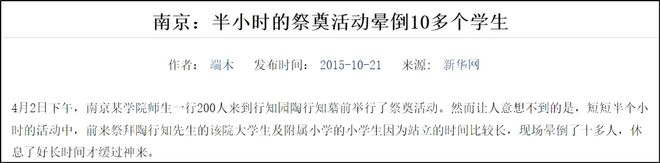 2015 年,一群学生去陶行知墓祭奠,结果活动开始半小时,就晕倒了 10 多个学生。