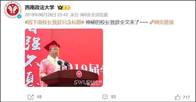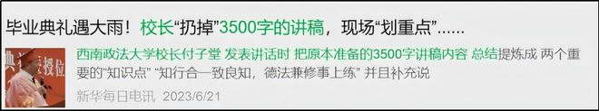 2023 年西南政法大学举行毕业典礼遇大雨,校长果断扔掉 3500 字的讲稿,只念了两句诗,然后让大家快散了,躲进室内。