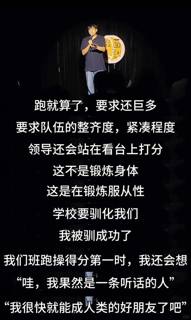 你还要豆腐块式整整齐齐跑操,不整齐就要被扣分。
