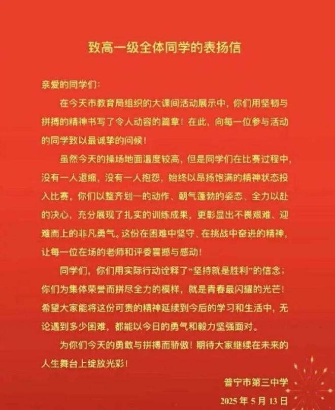 “虽然今天的操场地面温度较高,但是同学们在比赛过程中没有一人退缩,没有一人抱怨,始终以昂扬饱满的精神状态投入比赛。”