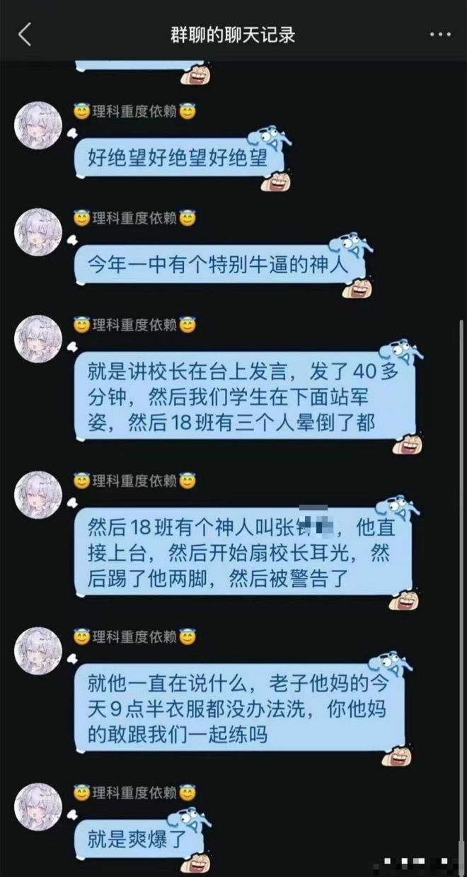 聊天记录里说,当时校长讲话讲了 40 多分钟了,闷热的夜晚,让站立许久的几位同学晕倒了,忍无可忍的张同学就选择站出来打老师。