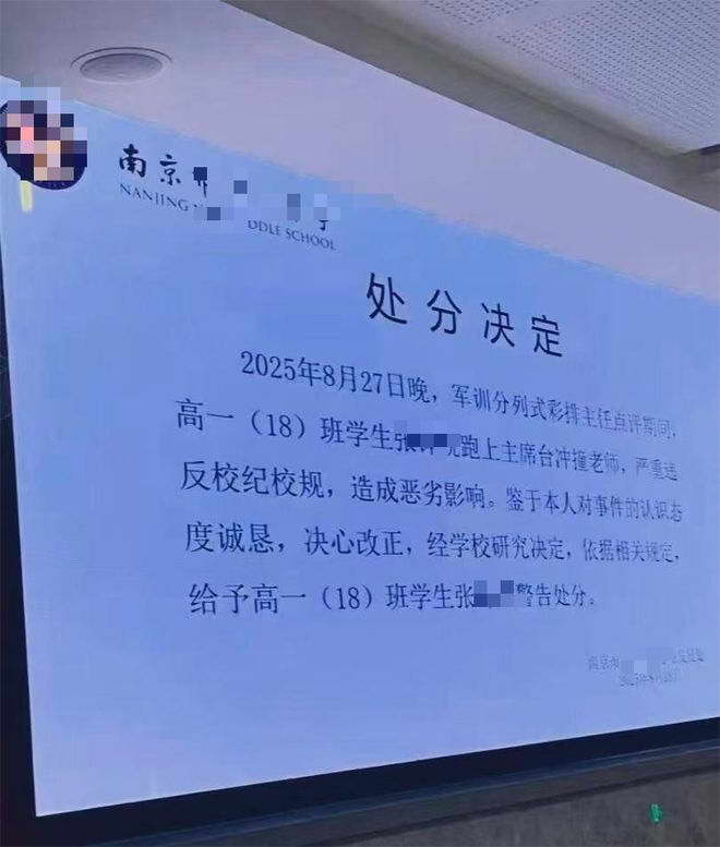 传闻南京某高中进行军训彩排,学生跑上主席团打了老师,事后他被警告处分。