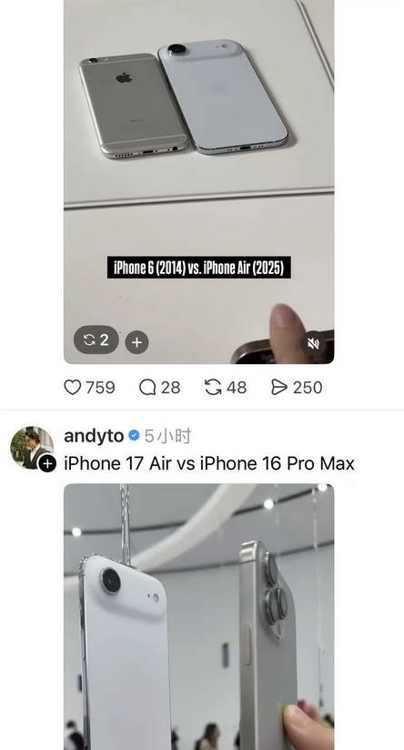 一张图是有人欢天喜地贴出 iPhone 17 air 和 16 Pro Max 的厚度对比,很明显,这也是苹果乐于让果粉看到和传播的点。然而,紧邻着它就是另外一张对比图,2014 年的 iPhone 6 和 2025 年的 iPhone 17 air,两者厚度相差无几。我觉得我在巧合之下看到的这两张图,比发布会本身传递出了更多信息,也更值得让果粉去思考。