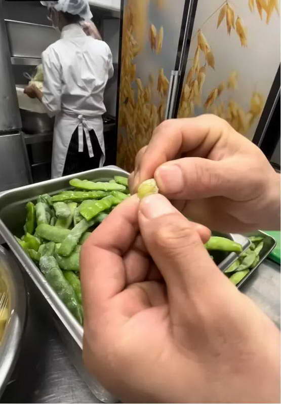 门店厨师长:它是生的,不是熟的,我可以掰开给您看,要是熟的豆子会软烂,这个豆子明显是生的。它只是冷冻保存的生食材,不是预制菜。这种冷链蔬菜,和超市里卖的冷链蔬菜一样,都是规范保存的。只是品种和超市常见的不一样。你看这个卫生,这个牛肉,是地地道道的内蒙肉,这个五花肉条,你看色泽非常鲜红。