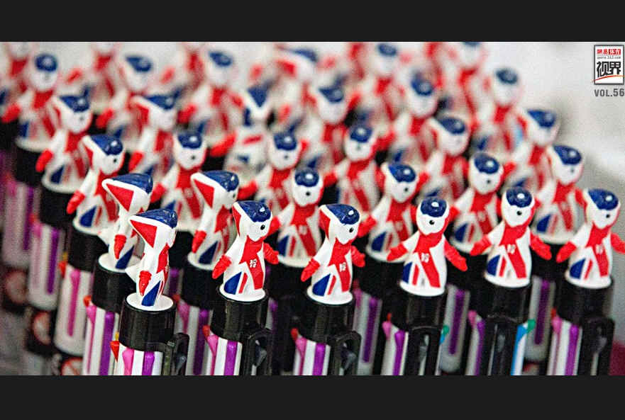 除此之外,伦敦奥运商品中,有5类毛巾床上用品、19类杯子、11类玩具车、190类别针、23类服装、4类毛绒玩偶吉祥物以及共18类徽章、腕带和手环,全部都由中国制造。人造草坪来自北京,主体育馆椅子来自上海,参赛国国旗产自武义,伦敦奥运几乎就是一个“made in china”的盛会。图为中国生产的伦敦奥运产品。