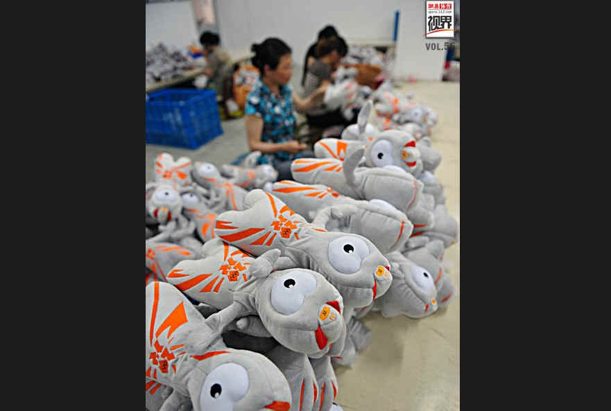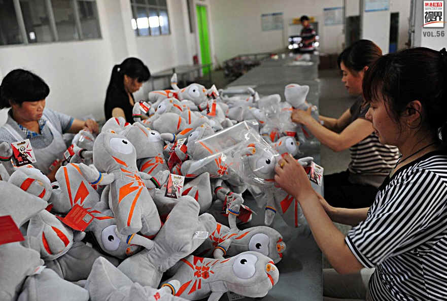 奥运吉祥物作为伦敦奥运会曝光率最高的产品,而是由中国江苏盐城的一个“彩虹公司”制造,在奥运会正式开始前,该公司已经完成了至少50万只吉祥物的生产。而在伦敦奥运会吉祥物生产上,至少4家中国公司承接。图为彩虹公司员工在工作。
