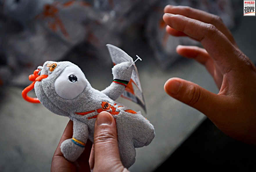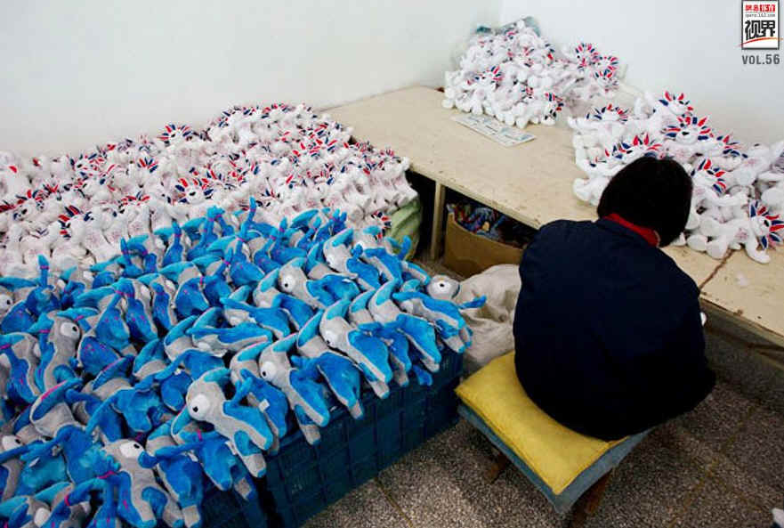 而在今年2月份,英国《太阳报》以《奥林匹克的奴隶》为题报道:英国伦敦官方吉祥物在中国血汗工厂制造,工人每做一个吉祥物只能获得18便士报酬。(注:1英镑=100便士,按照1英镑=10人民币的汇率计算,相当于1.8元)英国伦敦官方吉祥物曼德维尔和温洛克售价20英镑/只,超过工作薪酬的100倍。中国再次以廉价劳动力的想象成为奥运会的制造者。图为彩虹公司员工在工作。