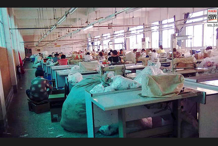 “彩虹制衣公司”的薪酬支付是计件制,即按照生产的吉祥物个数而非工作时间计算薪酬。大多数的工人每个月可以赚取1600-1700元,少部分则只能赚到900元一个月的薪水。而在当地,合法的最低收入线是930元。工人们还透露,当检查人员来时,他们被要求说谎,隐瞒超时工作的现实。一名叫李泉(化名)的工人说,制作一只吉祥物的工序很复杂,一只温洛克需要缝制30针,而一只曼德维尔需要缝制至少54针,就算是熟练工,两天里最多也只能制作60只温洛克。(注:60只温洛克的薪酬大约是108元)工作中的背颈总是僵硬疼痛,但这都是为了生存。”图为彩虹公司。