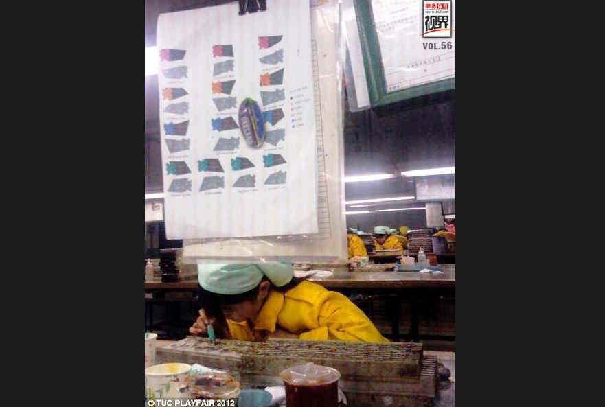 除了超过《劳动法》规定3倍的高强度工作时间,如果工人们在下班时未清理工位,他们就会被扣除掉一整天的工资。一名40岁左右的工人张青(化名)对《太阳报》记者透露:“这份工作非常疲累,但我没有更多选择。”《太阳报》披露这家位于江苏省的“彩虹公司”承接了英国本土著名的毛绒玩具制造商Golden Bear的订单,Golden Bear三年前从英国奥组委获得一份数百万美元的合同,被授权制造伦敦奥运会吉祥物小狮子等等。图为彩虹公司员工在工作。