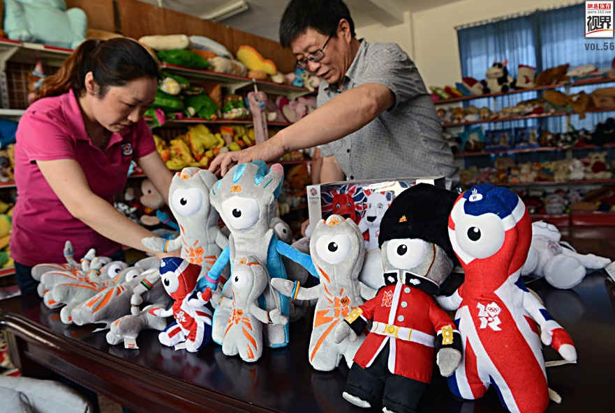 伦敦奥运会吉祥物是“捞金利器”。这次《太阳报》批露的丑闻是由一支由学生和学者组成的公益组织暗访“彩虹公司”后曝光。除了高强度的工作外,在“彩虹制衣公司”60-100人的工人当中,有相当数量的“童工”,未到政府规定的法定工作年龄,利用寒暑假等休息日打工。英国《每日邮报》也撰文披露了奥运“血汗工厂”的更多内幕,据《每日邮报》报道,奥运纪念章出自一家中国工厂,这家工厂大量雇用年龄仅为15岁的童工,制作一个纪念章,工人只能得到6便士(合人民币0.6元)的酬劳。图为中国公司展示奥运产品。