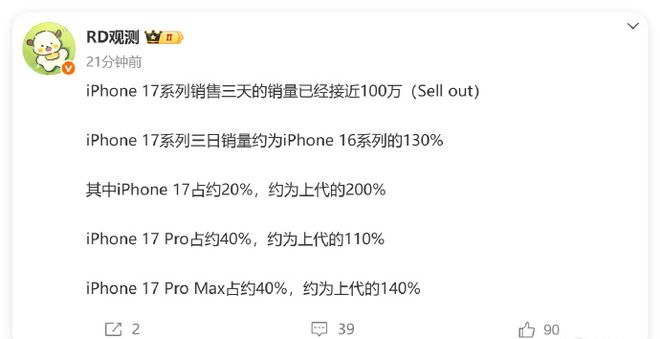 根据数码博主 RD 观测的爆料,截至 9 月 23 日,它全渠道销量已逼近 100 万台,比去年 iPhone 16 系列同期提升约 30%,创下苹果中国区首周销售新纪录。