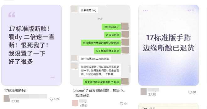 除了 Pro 版,iPhone 17 标准版也被很多用户反映有 “断触” 问题,比如屏幕边缘点了没反应、打字总漏字母、触控不灵敏,调设置也没用。