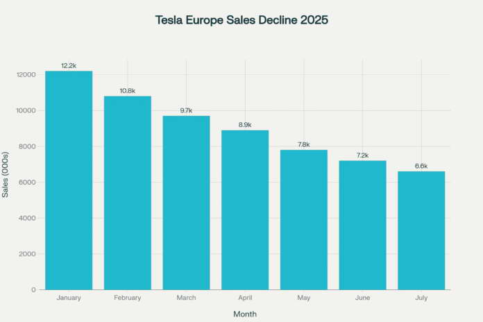 根据 ACEA (欧洲汽车制造商协会)的数据,在今年 7 月份,特斯拉销量同比下跌了 42.4%,在欧盟这个 4.5 亿人口市场,它只卖了 6600 台。