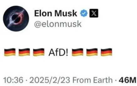 比如最近,马斯克就直接连线英国伦敦的抗议活动,呼吁群众 “挺身而出” 。之前的德国大选,老马也公开在 X 上指手画脚,不管对手还是友军,都有点看不下去了。