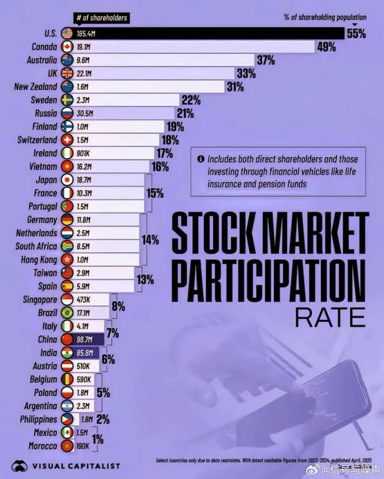 第一名是美国,55% 的股市参与度,3 亿美国人中有 1.8 亿多人都在股市里。