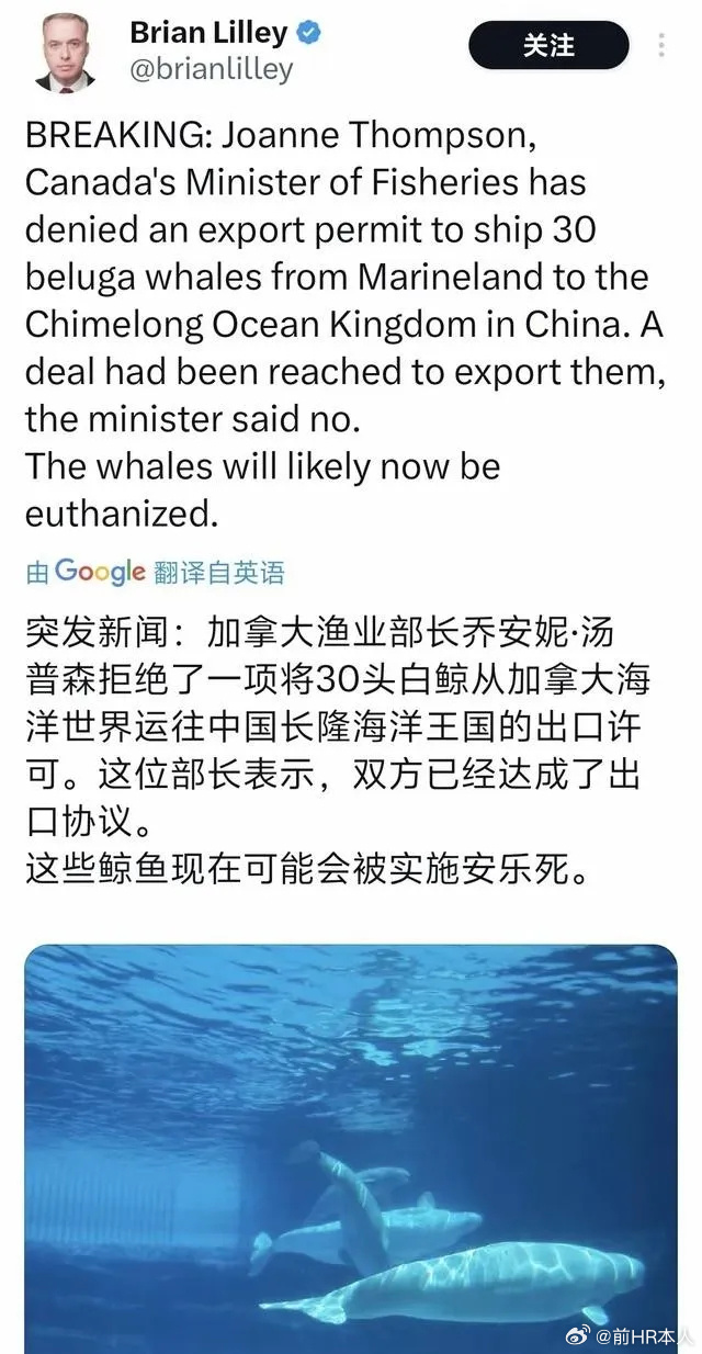 加拿大一个 MarineLand 海洋乐园倒闭,表演白鲸无法放生,已经有 5 头死亡,长隆海洋王国愿意购买剩余 30 头白鲸,双方已经签署协议。但,加拿大农业部长不同意。宁肯把白鲸都饿死掉,也不愿把白鲸交给长隆。