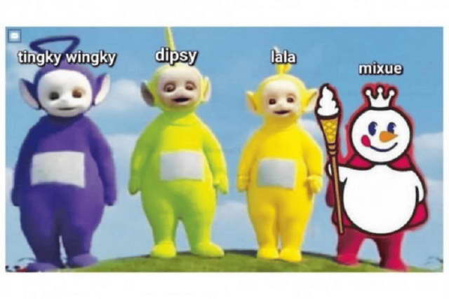 但雪王这个大白胖子往那一站,毫无理解门槛,还自带传播属性。人们忍不住就把它 P 到了天线宝宝上。