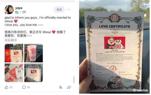 比如在情人节喝一杯蜜雪,就可以和雪王领结婚证。