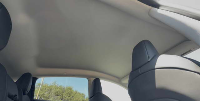 但事实是,丐版 Y 的车顶材质依旧是玻璃的。之所以车里看着没有天幕,是因为特斯拉在生产的时候直接在玻璃车顶下面加了个织物顶棚。