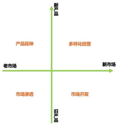关于企业的增长策略有个很简约的模型,就是安索夫矩阵(下图)。用新旧市场和新旧产品两个维度,产生了四种增长策略。
