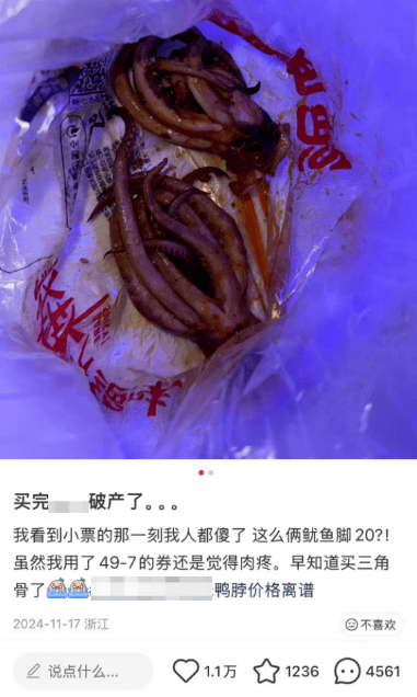 印象中曾经买过 2 个鱿鱼,付了 30 左右,比一顿正经外卖还贵,账单到手那一刻,退也不是,买又肉疼,非常难受。
