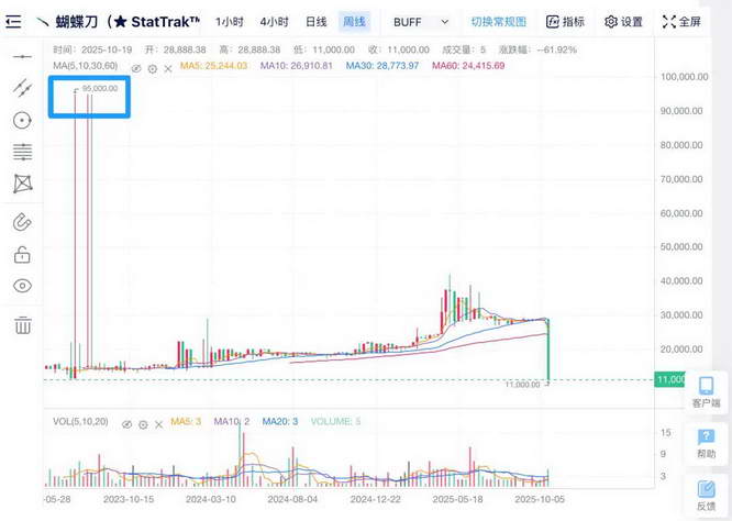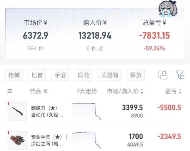 小发同事的自动化配色蝴蝶刀,在事发之前从 8000 多一路涨到了 13000 左右,然而现在。。。