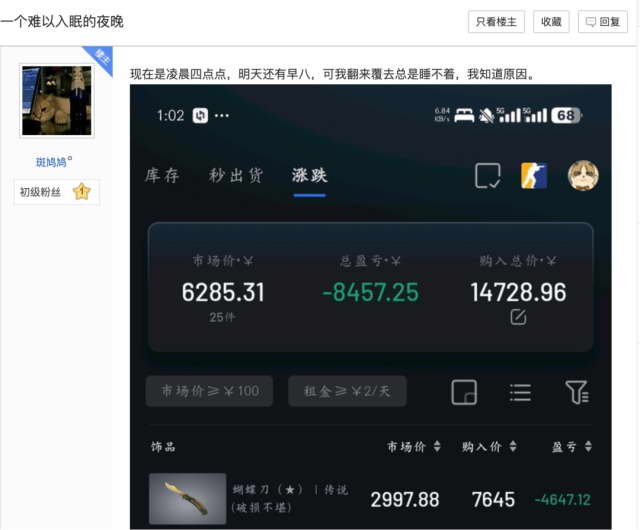 普通散户们也遭受了无妄之灾,贴吧里一位男大,在更新前夜入手了八千块钱的蝴蝶刀,几个小时后蒸发了四千多。