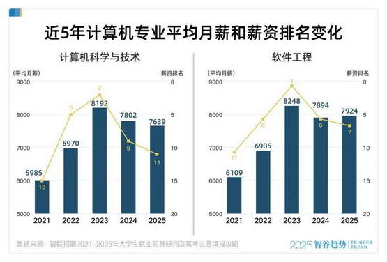 智联招聘报告显示,过去三年里,计算机专业毕业生的平均月薪从 8192 元降至 7639 元,薪资排名也从第二到跌出前十。类似的变化,也出现在软件工程专业。