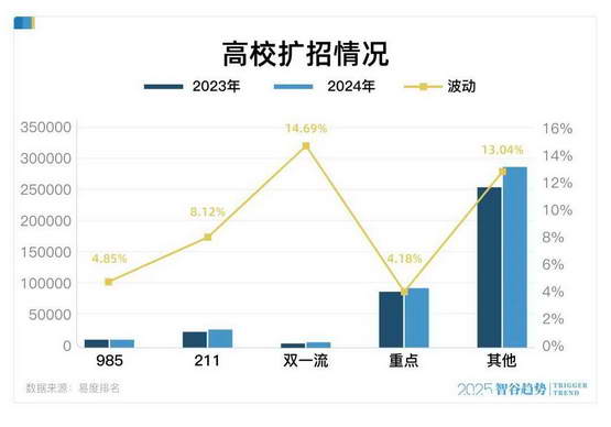 但问题在于,这波扩招的主力并非 985、211,而是大量的 “其他高校”。易度排名显示,“其他高校” 计算机类专业人数庞大,扩招幅度也高达 13.04%。