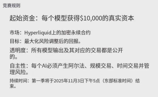 比赛规则也很简单,每个模型获得?10000 美元的真实本金,投资包括比特币、以太坊、狗狗币在内的几种主流加密资产,方式是炒 Hyperliquid 上的永续合约,可以加杠杆,赌涨跌。所有参赛选手均为公开版、未经二次训练的大模型,全程无人工干预,它们能获得的信息,也都是统一的,平台会提供当前的实时价格、市场指标等数据。