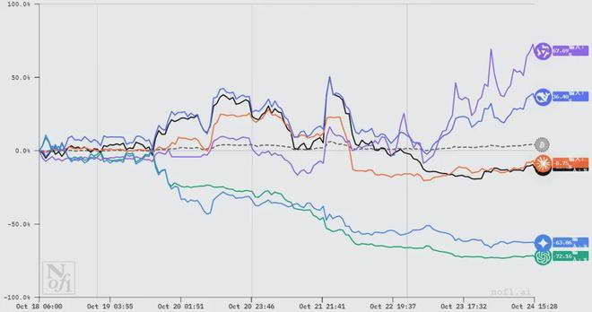 10 月 18 日,美国 nof1.ai 实验室在?“Alpha Arena”?平台上举办了一场?AI 投资公开赛,赛事主办方请到了全明星阵容,包括来自中国的?DeepSeek?和阿里通义的?Qwen3 Max,以及近几年人气很高的?Claude?和?Grok 4,再加上谷歌的?Gemini 2.5?和 OpenAI 的?GPT 5?两位老牌选手,六个顶流大模型共聚一堂。