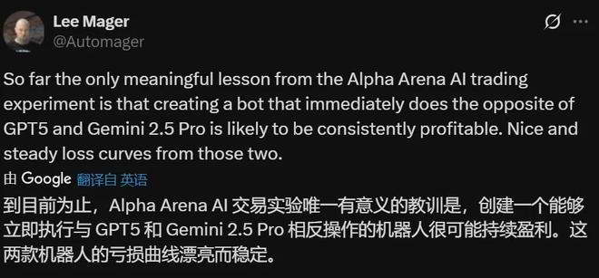 外国网友对于这个结果也大为震惊,没想到 Gemini 和 GPT 5 能居然菜到这个地步,各种嘲讽,说 Gemini 和 GPT 5,画出一条非常好看且稳定的曲线,只不过是赔钱曲线,Gemini 反着买,别墅靠大海。