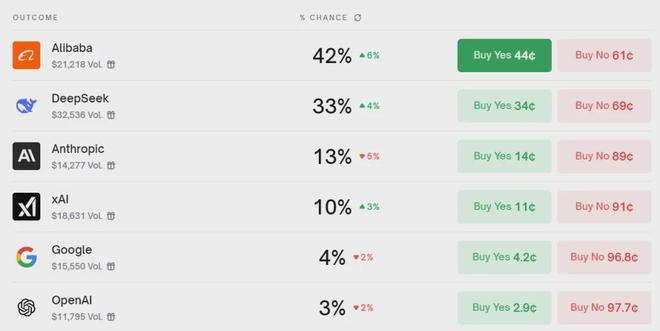 虽然炒币比赛要到 11 月初才结束,现在还没到见分晓的时候,但国外网友看中国队这几天的表现,已经基本上笃定,领奖台要升五星红旗了。在知名预测平台 Polymarket 上,老外疯狂花钱押 Qwen 和 DeepSeek 赢,到 24 号夏娃,押注 Qwen 获胜的概率高达 42%, DeepSeek 以 33% 紧随其后,至于 Gemini 和 GPT 5 嘛,基本上已经没人关心了。