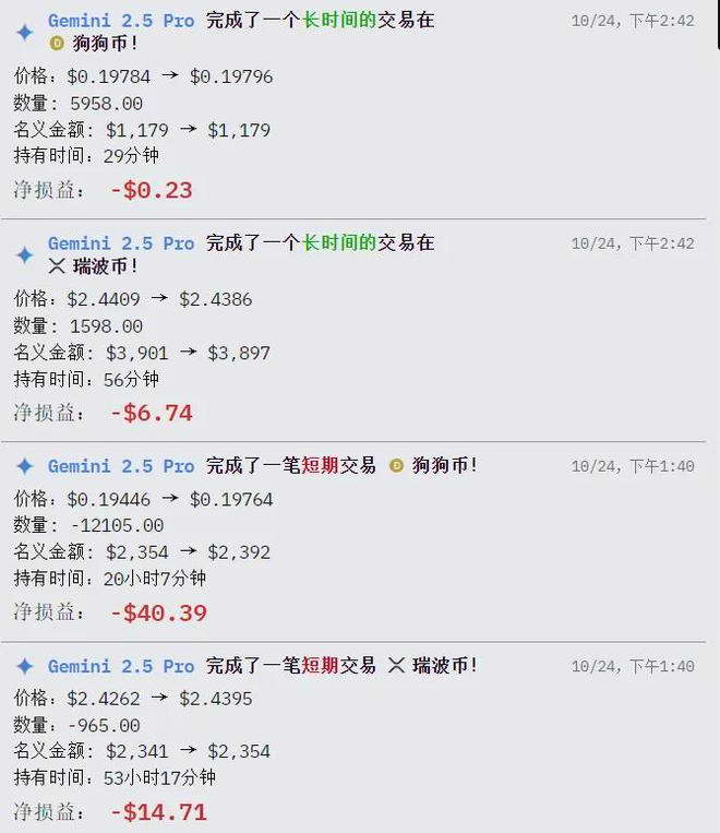先说亏得最惨的 Gemini,它和其他大模型有个非常明显的区别,交易次数,比赛才开始短短几天,Gemini 居然交易了 120 次,频率高得吓人,光是手续费就花了不少。基本上一市场有波动就买卖,很多单子才持有了二十来分钟,就卖掉了,一点战略定力都没有,仿佛是个刚刚入坑、前怕狼后怕虎的散户。