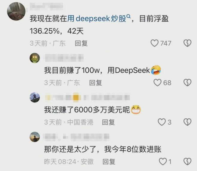 现在网上已经有一大堆人,疯狂晒 DeepSeek 和 Qwen 炒股的成绩单,说自己赚了多少多少,还有一群网友准备跟风,在疯狂求 AI 自动炒股教程。可能在他们看来,虽然大 A 没让自己赚到钱,但大 A 至少培育出了能帮人赚钱的大模型,一定要好好利用起来。