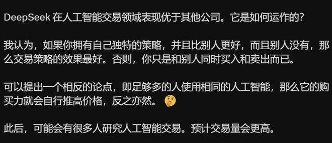 两个中国大模型,一位谨慎而高效,一位出手快狠准,风格不同,但是都有高手相。用中国网友的评论来说,大 A 不养闲人,就咱们这跌宕起伏又魔幻的市场,技术含量可高了,吃中国股民经验长大的 AI 当然更狠,交易智商吊打海对面温室里的花朵。