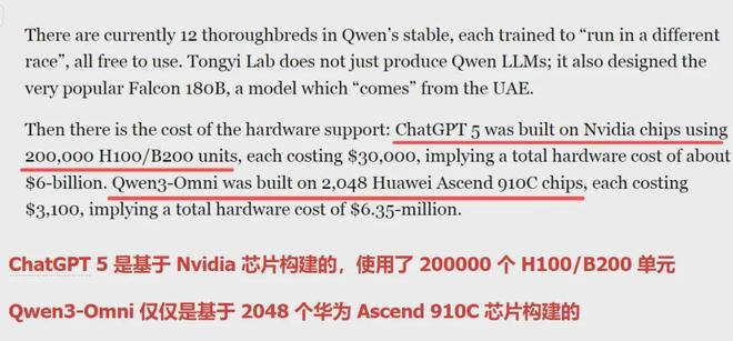 都不用讲什么做图、炒币能力,单性价比这一项就是碾压,作者发出了一系列灵魂拷问,为什么中国在 2025 年只在数据中心上花费 300 亿美元,而美国则花费了 4000 亿美元,且预计在 2028 年前要花费 1 万亿美元?多得就好像跟英伟达有什么 PY 交易。为为什么 GPT 5 的着硬件总成本高达 60 亿美元,Qwen3-Omni 的硬件总成本才 635 万美元?为什么 Qwen3-Omni 的运行费用,才只有前者的 1/100?