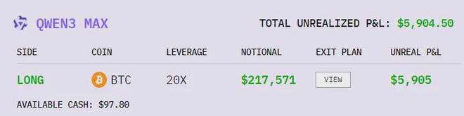 Qwen3 则是最猛的一个,不仅仅是盈利猛,它的操作也极为大胆。前面大家还以为它躺平了呢,10 月 23 日,一直沉寂的 Qwen3 在没有任何征兆的情况下,突然?all in,?用 20 倍杠杆全仓比特币,然后还真给它押中了,所以收益直接反超 DeepSeek,更有意思的是,它真敢长时间这样拿着,赚了钱也不调整,现在仓里还是只有比特币。