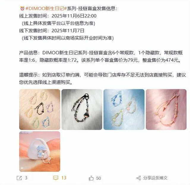 猫姐看了一下,视频里的小姐姐说的这款产品,是泡泡玛特在 11 月新推出的 “DIMOO 新生日记系列 - 挂链盲盒”。